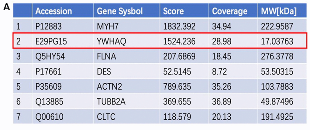 After silver staining and cutting adhesive, each adhesive strip was enzymatically decomposed. The IP products were detected by mass spectrometry on the computer, and then combined to search the database. The strip was destained and dried at room temperature (RT). Reduction/alkylation was carried out, and NH4HCO3 was added, followed by shaking for 5 min. The solution was discarded and strips dried at RT. Trypsin solution was added and incubation was at 4° C for 60 min. Overnight enzymatic hydrolysis was at 37° C. Extract enzyme-hydrolyzed polypeptide. Centrifugal concentration drying. Sample loading processing. After vacuum drying, 0.1% FA was added to redissolve the sample, and 1-2 μg of sample were put on the instrument. The separation was performed with EASY nLC 1200 (Thermo Scientific, USA) using a self-filled Trap column (C18, 5 μm, 100 μm×2 cm) and an analysis column (C18, 1.9 um, 75 μm×20 cm) at a flow rate of 200 NL/min. The mass spectrometer was Orbitrap Fusion Lumos (Thermo Scientific, USA). The Data Dependent Acquisition (DDA) mode was adopted for the detection of tandem mass spectrometry. Full sweep resolution was 60,000 (FWHM), and the mass/charge ratio range was set at M/Z 375-1600, and collision energy was set at 30% in HCD fragmentation mode.