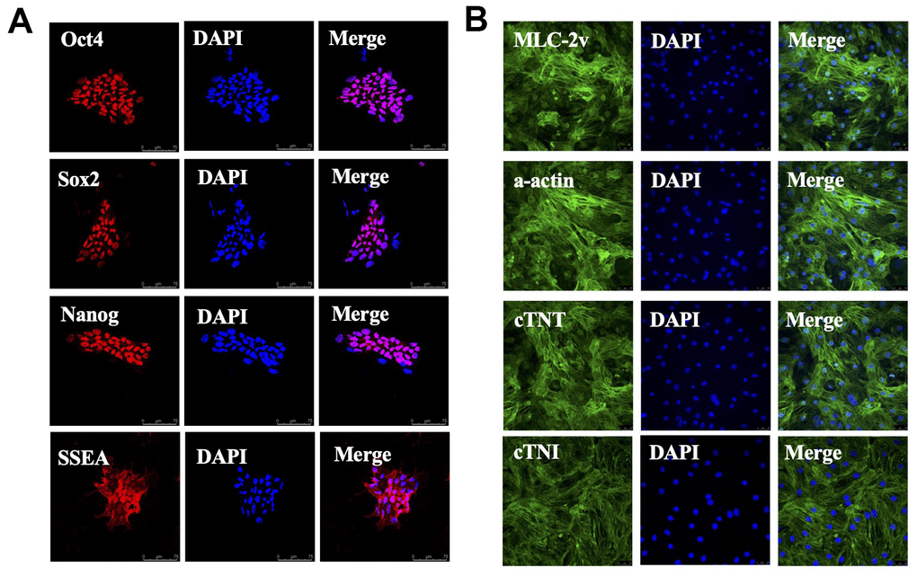 The induced cardiomyocytes showed high purity and continuous beating. Four myocardial cell protein markers, MLC-2V, α-actinin, cardiac troponin I (cTnI) and cardiac troponin T (cTnT), were detected by immunofluorescence staining. This indicated that the induction of differentiation into cardiomyocytes was successful and that the purity of the cardiomyocytes was relatively high (Figure 3B).