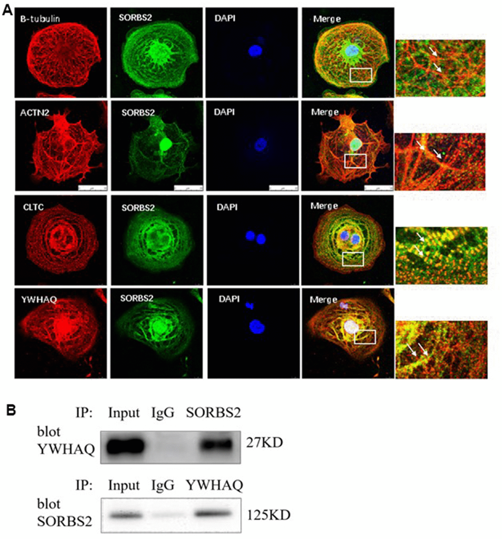 We further determined the localization of the selected proteins and the expression location of SORBS2 in the induced cardiomyocytes using immunofluorescence staining. We found that β-tubulin, ACTN2, CLTC and YWHAQ showed co-localization with SORBS2 (Figure 4A). Meanwhile, we used the co-immunoprecipitation assay to verify the interaction between SORBS2 and YWHAQ. These data collectively demonstrated that SORBS2 interacted with YWHAQ in normal myocardium (Figure 4B).