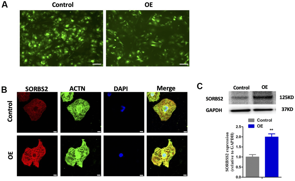 To demonstrate the capacity of SORBS2 in cardiomyocytes, we created two appropriate carriers HBLV-GFP-PURO-NC and HBLV-h-3*flag-GFP-PURO to disrupt the cardiomyocytes. We purchased the lentivirus from HANBIO and strictly followed the instructions. The lentivirus could transfect after the hESC reached nearly 70% confluence with 1×106 viruses per well of a 6-well plate. At 48 h after transfection, green fluorescence intensity could be observed under a fluorescence microscope. The transfected target cells were then isolated to proceed with the next experiments.