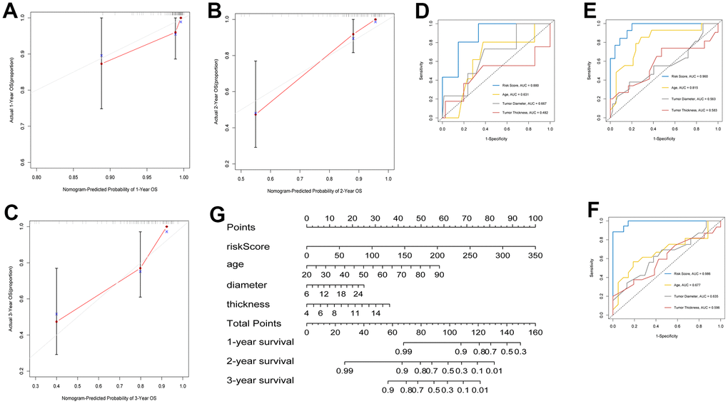 A prognostic map, including risk score and clinical variables, was established to predict the prognosis of patients with UM. Among various clinical features, age, tumor diameter, tumor thickness, clinical stage, and extrascleral extension were used as candidate prognostic factors to explore whether they were the best prognostic indicators, and the AUC curves of 1-, 2-, and 3-year OS were analyzed as prognostic indicators. The AUC values of the risk score all exceeded 0.75 (Figure 4D–4F). The results showed that risk score was the best independent prognostic indicator. In nomogram, the score of each independent predictor in the line chart is the score of the corresponding upper score scale (points), and the total score of each subject (total points) is the sum of the scores of each independent predictor. The value of the total score on the risk axis of UM occurrence is the survival time for UM. The higher the total score, the lower the corresponding 1-year, 2-year and 3-year OS (Figure 4G). The line chart shows that the calibration curve is approximately diagonal, indicating strong stability in predicting prognosis (Figure 4A–4C).