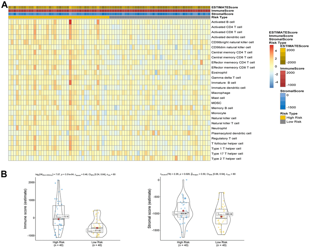 There are at least 28 kinds of infiltrating immune cells in the tumor. To reveal the infiltration of immune and stromal cells in UM, single-sample gene set enrichment analysis(ssGSEA) was used to analyze the enrichment of 28 kinds of immune-related cells in the high- and low-risk groups [39], and the stromal cells and immune cells were compared in the two risk groups. The correlation between risk score and 28 types of immune-related cells was analyzed, as well as the correlation between parent genes corresponding to five AS events and tumor-infiltrating immune cells.