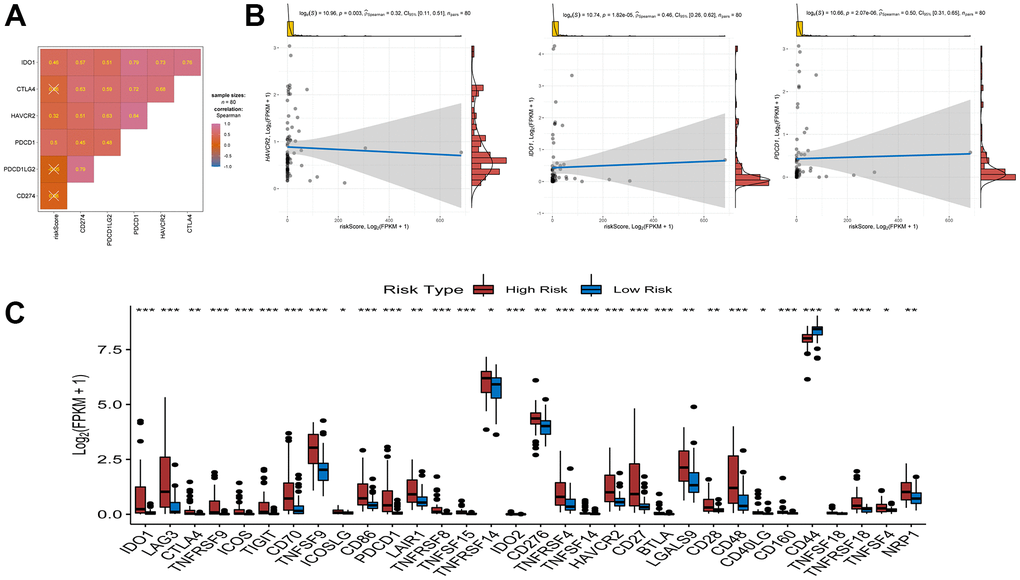 ICB treatment involves six key genes, namely programmed death 1 (PD-1, also called PDCD1), programmed death ligand 1 (PD-L1, also called CD274), programmed death ligand 2 (PD-L2, also called PDCD1LG2), cytotoxic T-lymphocyte antigen 4 (CTLA-4), indoleamine 2,3-dioxygenase 1 (IDO1), and T-cell immunoglobulin domain and mucin domain-containing molecule-3 (TIM-3, also called HAVCR2) [40–42]. To explore the potential role of the risk signature in the ICB treatment of UM, we analyzed the correlation between the risk score and the expression of these six ICB key genes and compared the expression of 47 ICB-related genes between the high- and low-risk groups.