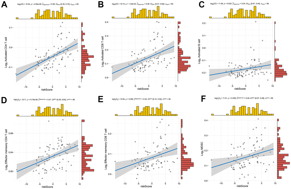 The analysis of ESTIMATE immune and stromal scores showed that the high-risk and low-risk groups had significantly different characteristics in terms of the tumor immune microenvironment (Figure 5A). The corresponding heatmap showed that the high-risk group had higher immune scores and contained more immune cells than the low-risk group. Similarly, low-risk patients had higher stromal scores, which means less immune infiltration, and there was a significant difference in immunity between the two groups. We analyzed the two groups. The immune score and risk score were statistically significant in the high and low risk groups (Figure 5B). Adopting single-sample gene set enrichment analysis (ssGSEA) [15] analyzing the correlation between 28 types of immune cells and the risk score, we found that the risk score was positive correlated with six types of immune infiltrating cells, including activated CD4 T cells, effector memory CD4 T cells, central memory CD4 T cells, activated CD8 T cells, effector memory CD8 T cells, central memory CD8 T cells, myeloid-derived suppressor cells (MDSCs), and B cells (Figure 6A–6F). Moreover, the parent genes corresponding to the five survival-related AS events contributing to the risk score were also significantly associated with tumor-infiltrating immune cells (Figure 7), which provides a new way to clarify the characteristics of the UM immune regulatory network.