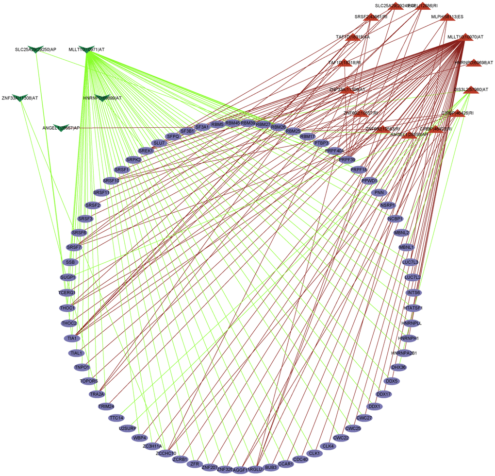 The interaction network between AS prognosis and splicing factors (SFs) was constructed based on correlation analysis to determine the potential mechanisms underlying AS alterations (Figure 9). There were five negative correlation with AS events (green arrows), 15 positive correlation with AS events (red arrows), and 71 SFs (purple ellipses) involved in the network. Among significant correlations, the strongest positive one was between TRA2A and MLLT10|10970|AT and the strongest negative one between TTC14 and DIS3L2|57980|AT. These results suggest that SFs are key regulatory factors participating in the regulation of AS events to further mediate the initiation and progression of UM.