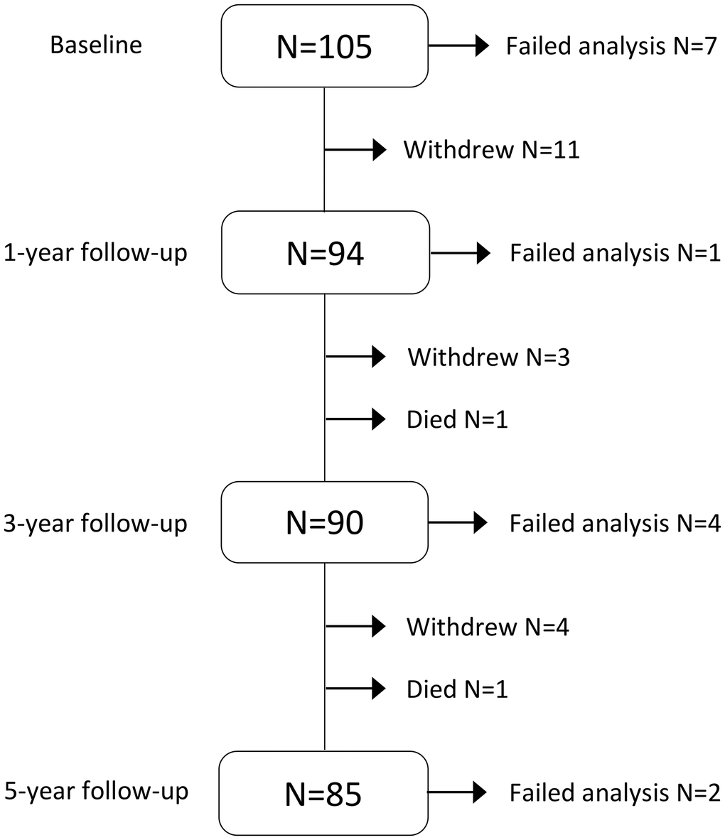 In total, 105 MRI participants were included and scanned at baseline. After five years, 85 participants remained in the study, none of whom were diagnosed with MCI or dementia. Participants who withdrew from the study, did so mainly during the first year. Two participants died of cancer in the HIIT group during the study. See Figure 1 for an overview of participants at each timepoint and MRI scans passing quality assessment and included in statistical analysis. For variables used in this paper, data were missing completely at random (X2 (1737) = 1747.66, p = 0.42).