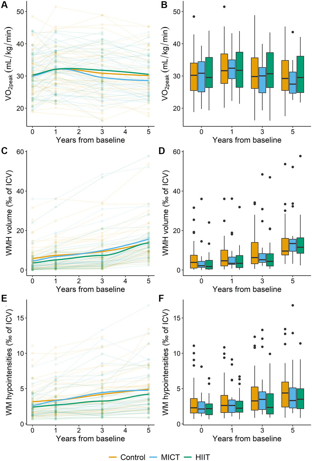 The baseline and the five-year demographic, clinical and VO2peak characteristics of the control, MICT and HIIT group participants in the MRI study are shown in Table 2. There were no differences between the three groups at baseline or after five years (Table 2A and 2B).