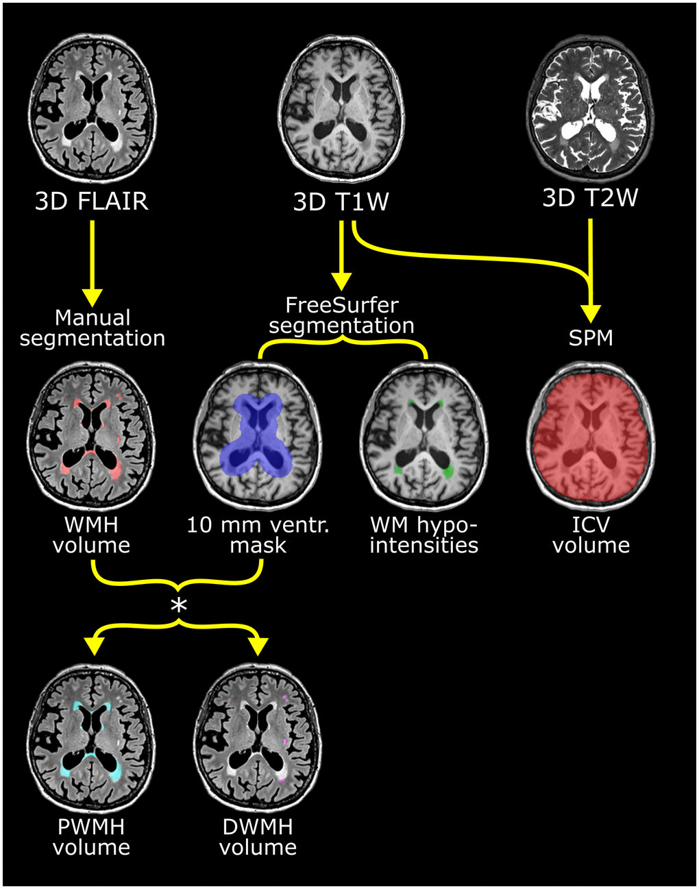 White matter hyperintensities (WMH), also known as leukoaraiosis, are the most common finding on brain MRI in persons aged 50 and older [1, 2]. Its presence is associated with functional impairments such as gait disturbance [3, 4] and cognitive decline [5], as well as diseases such as depression [6], stroke and dementia [7]. WMH appear as hyperintense areas in the brain on T2-weighted MRI scans, e.g., fluid-attenuated inversion recovery (FLAIR), and are usually symmetrically distributed around the ventricles (periventricular WMH, PWMH) and in the deep white matter (deep WMH, DWMH). PWMH and DWMH are associated with overlapping as well as unique genetic markers [8], etiologies [9, 10], and clinical correlates [11, 12], leading to the two subdivisions being regarded as different entities [13]. Even though WMH have a clinical impact in old age and several risk factors are identified [14–16], there is no consensus as to how to treat or reduce them.