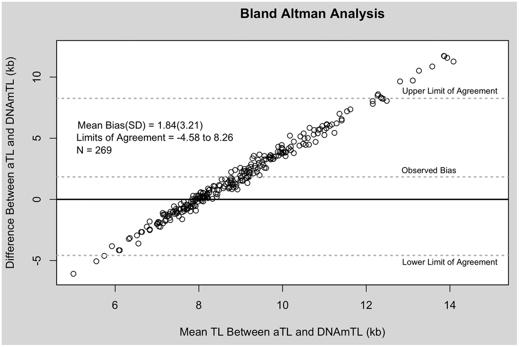 TL measurements estimated using qPCR were significantly longer than those estimated using DNA methylation in paired sample t-tests (Cohen’s d = 0.77, p < 0.001). Bland Altman analysis revealed a mean bias of 1.84 kb and wide limit of agreement (−4.58 to 8.26 kb). DNAmTL measurements fell within a narrower window, whereas aTL tended to overestimate the longest telomeres (Figure 1).
