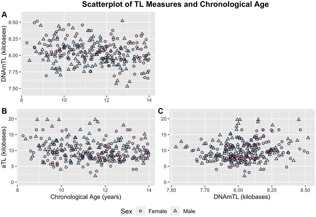 Figure 2. Scatterplots of chronological age and TL measures distinguished by sex. (A) DNAmTL and chronological age. (B) aTL and chronological age. (C) aTL and DNAmTL. Females and males distinguished by pink circles and blue triangles respectively.