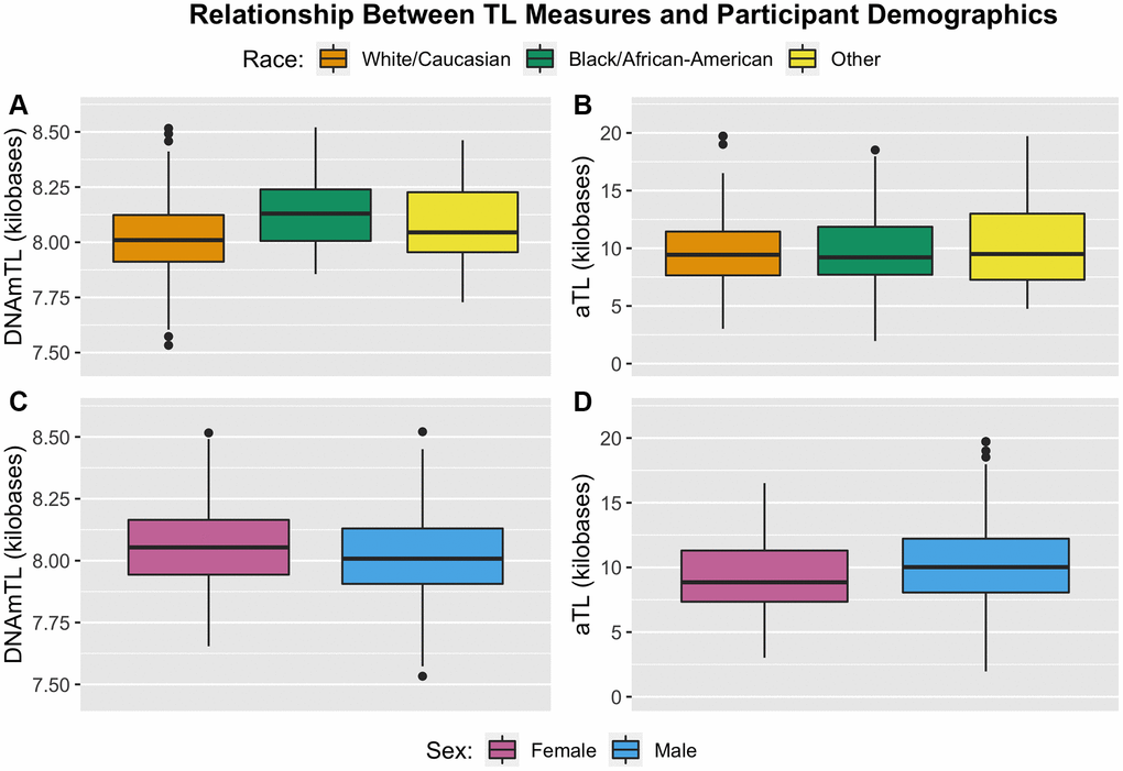 Figure 3. Boxplots illustrating distribution of TL measures by participant demographic factors of race (top) and sex (bottom). (A) DNAmTL partitioned by racial status. (B) aTL partitioned by racial status. (C) DNAmTL partitioned by sex. (D) aTL partitioned by sex.