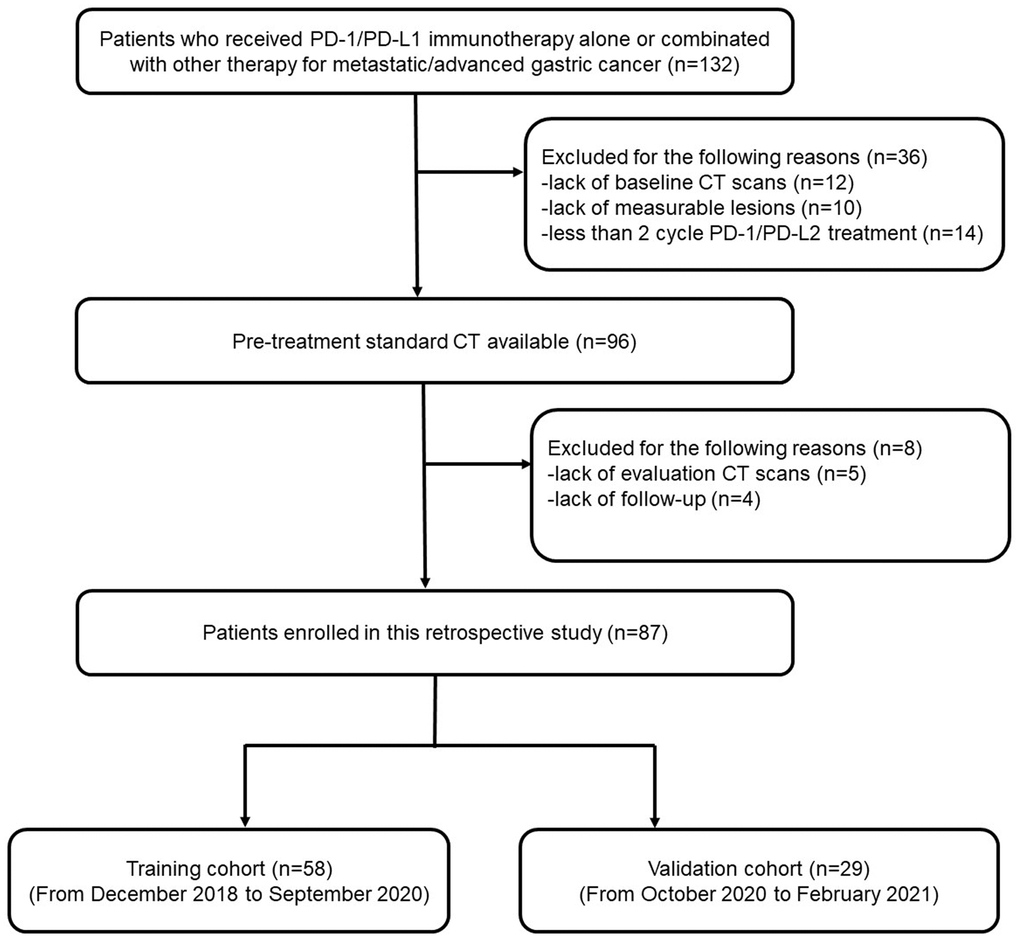 Patients with advanced gastric cancer receiving PD-1 inhibitors from December 2018 to February 2021 were enrolled. The inclusion criteria were as follows: 1) Patient age was > 18 years and < 75 years old. 2) Relapsed or metastatic inoperable gastric adenocarcinoma was cytologically or pathologically confirmed. 3) Gastric cancer progressed after the first line of standard chemotherapy or a targeted molecular therapy and a subsequent anti-PD-1 therapy for at least 4 cycles. 4) The cancer had at least one evaluable lesion that met the Response Evaluation Criteria in Solid Tumors (RECIST 1.1). 5) CT imaging data before and after anti-PD-1 treatments were complete. 6) Follow-up data were complete. Patients whose gastric lesions were not clearly delineated under CT images or whose metastatic lesions could not be measured or evaluated were excluded from this study. Patients whose survival analyses could not be performed were also excluded from the study. All enrolled cases were further distinguished into a training set and validation set according to the enrolled time stage [15]. The cases enrolled before September 2020 were divided into a training set, while enrolled cases from October 2020 to February 2021 were divided into a validation set.