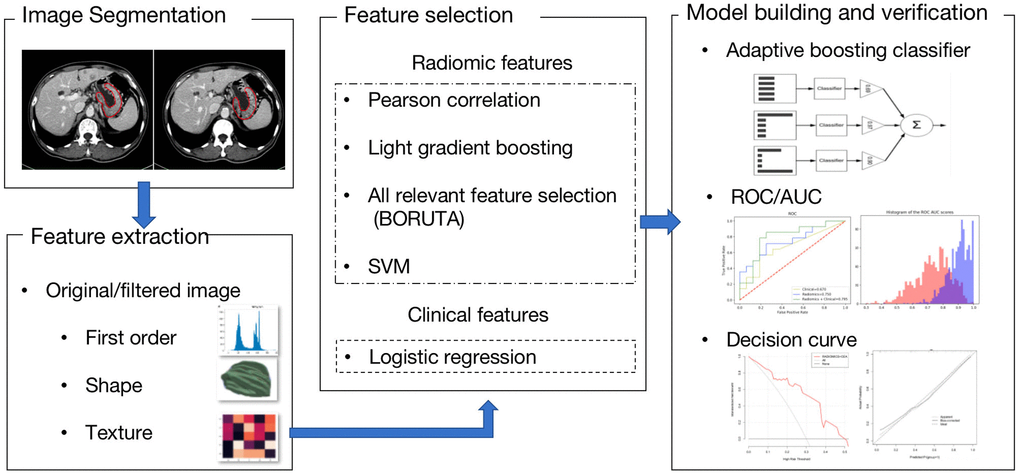The primary tumor area on each slice of transverse CT images was manually segmented and set as the region of interest (ROI) by two independent experienced radiologists who were blinded to this study design though the commercial software AccuContuor (Manteia Medical Technologies Co, XiaMen, China). Both radiologists repeated the segmentation procedure twice. The ROI segmented images were resampled with an isotropic voxel size (2×2×2 mm3) and interpolated with the Bspline algorithm. Filters including wavelet and Laplacian of Gaussian (LOG) with different sigma values (0.5–5 with steps 0.5) were applied to all the segmented images. Subsequently, the images were discretized into fixed bin widths. A total of 103 radiomics features were extracted from the original segmented images including 13 shape-based features,17 first-order based features, 22 texture features consisting of gray level cooccurrence matrix (GLCM) features, 16 gray level run length matrix (GLRLM) features, 16 gray level size zone matrix (GLSZM) features, 14 gray level dependence matrix (GLDM) features, and 5 neighboring gray-tone difference matrix (NGTDM) features, through the ontology-guided radiomics analysis workflow (O-RAW) package [17]. For filtered images, the same radiomics features were extracted except the shape-based features. Therefore, a total of 1723 radiomics features were extracted and analyzed in each patient.