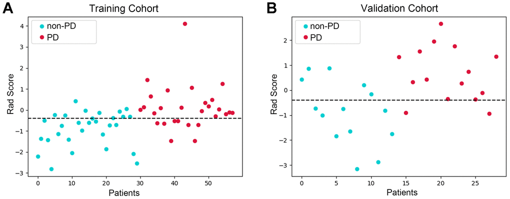Figure 3. Differences in rad-scores between anti-PD1 treatment responders were detected. Scatter plot of the rad-score in the training set (A) and in the validation set (B). The blue dots represent the rad-score of patients with PD, and red dots represent the rad-score of patients without PD. Our analyses revealed that the patients with PD after immunotherapy had obviously higher rad-scores than those without PD in the training and validation set.