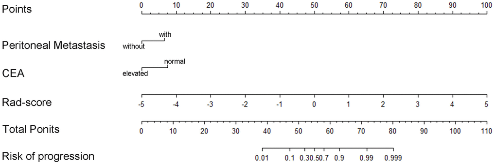 Figure 4. The radiomics nomogram for predicting anti-PD-1 efficacy in patients with advanced gastric cancer based on the rad-score with clinicopathological risk factors for CEA level and tumor metastasis site.