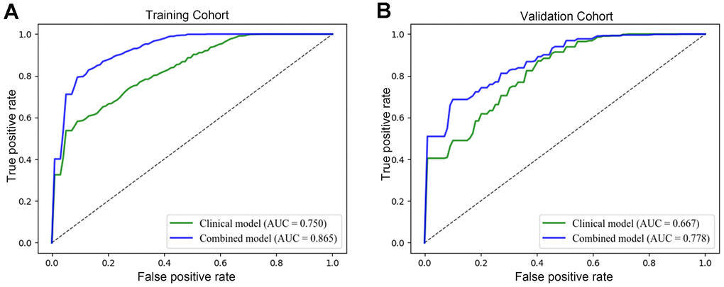 Figure 5. Evaluation of the performance of the radiomics model. The operating characteristic curve analysis of the clinical and radiomics models was plotted in the training set (A) and in the validation set (B). The AUCs of the radiomics model were 0.865 (95% CI: 0.812-0.828) and 0.778 (95% CI: 0.732–0.776) in the training and validation datasets. While the AUCs of the clinical model were 0.750 (95% CI: 0.718–0.734) and 0.667 (95% CI: 0.665–0.724), respectively.