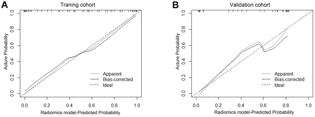 Figure 6. The calibration curve showed the consistency between the predicted and observed probabilities. Calibration curves were plotted in the training set (A) and in the validation set (B). The 45-degree reference line represents an ideal standard calibration line. The solid line represents the prediction performance of the radiomics model without overfitting correction. The dotted line is the performance of the nomogram after bootstrap correction, which is used as the prediction of future accuracy. The closer the prediction curve is to the standard curve, the better the prediction ability of the nomogram.