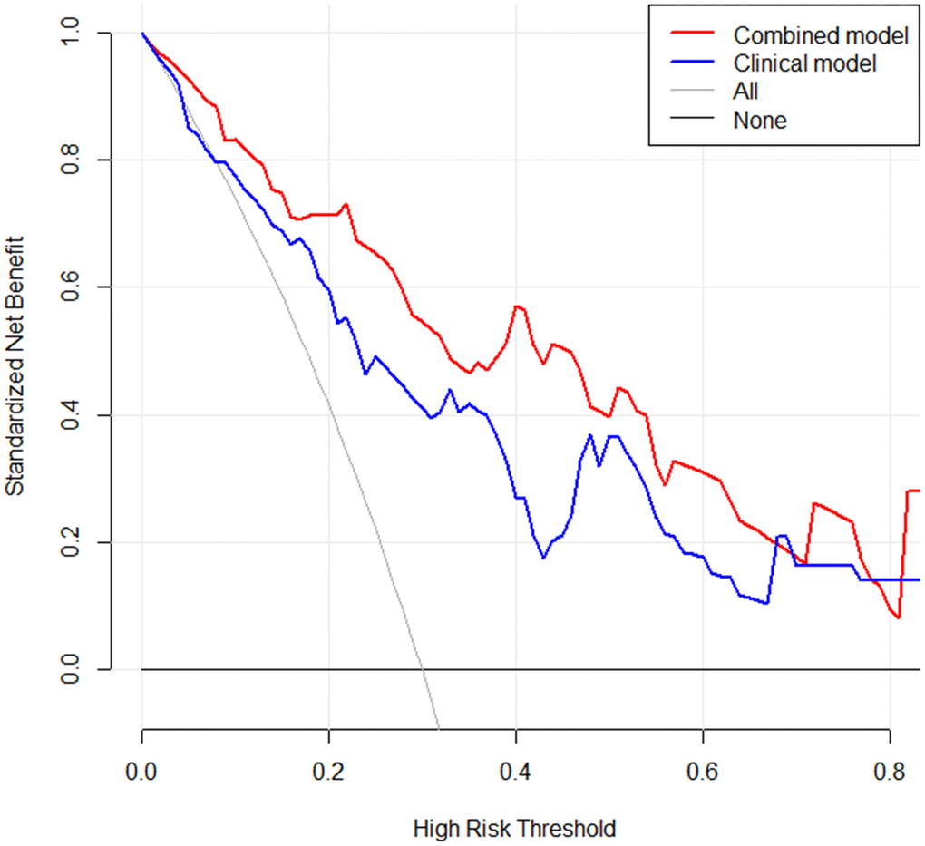 Figure 7. A decision curve was applied to compare the difference in net benefit of the clinical model and radiomics model in the validation cohort. X-axis means threshold probability, Y-axis means net benefit. The decision curve showed that when the threshold probability exceeds 10%, and the net benefit of clinical application in radiomics model would exceed the clinical model.