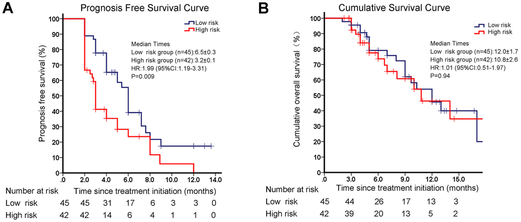 All enrolled patients were followed up to monitor PFS and OS. Two patients’ follow up data were lost, and 85 patients had completed survival data. Among them, 61 patients had PD, and 35 patients died. The median follow-up time was 10 (range: 3–23) months. Based on the radiomics nomogram, we identified the cutoff value for total points as 54 for classifying patients into high risk of disease progression and low-risk disease progression groups after PD-1 inhibitor treatment. Patients with more than 54 total points were grouped in the high-risk group, and the others were grouped in the low-risk group. We found that there was no difference in OS between the high- and low-risk groups (12.0 vs. 10.8 months, p = 0.94). However, the median PFS in the low-risk group was 6.5 months, which was significantly longer than the 3.2 months in the high-risk group (hazard ratio (HR): 1.99, 95% CI: 1.19-3.31, p = 0.009) (Figure 8A, 8B). These data indicated that patients with low-risk values discriminated by the radiomics model had better survival outcomes after immunotherapy. Our univariate and multivariate regression analyses confirmed that the risk value determined by the radiomics model well reflected the prognosis of PFS (Table 4).