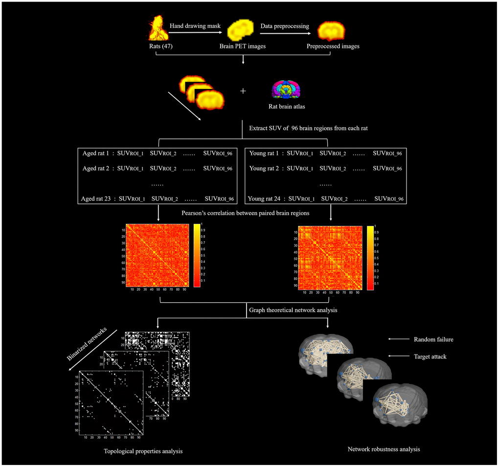 As mentioned above, we investigated differences in the brain metabolic network between aged rats and young rats based on 18F-FDG PET imaging, involving topological properties and network robustness. The results showed decreased regional network measures and vulnerable robustness of brain metabolic networks in aged rats. The findings support the idea that aged rats have similar aging-related changes in the brain metabolic network to the human brain, which can be used as a model for aging studies to provide targets for potential therapies that promote healthy aging.