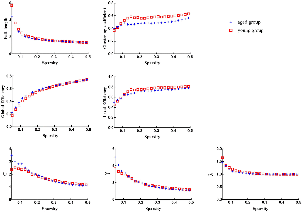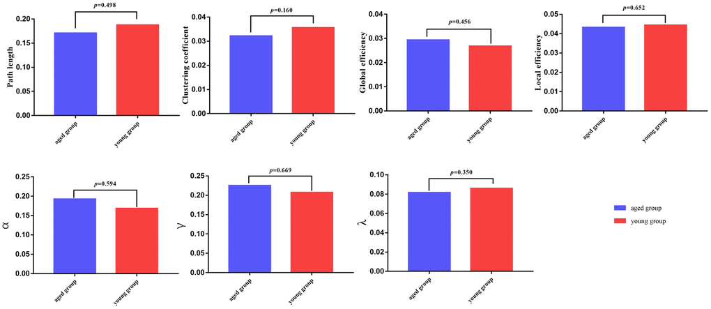 There were no significant differences in global network properties (path length (Lp), clustering coefficient (Cp), global efficiency (Eglob), or local efficiency (Eloc), σ, γ, λ) between aged rats and young rats (p > 0.05) (Table 3 and Figures 2, 3).