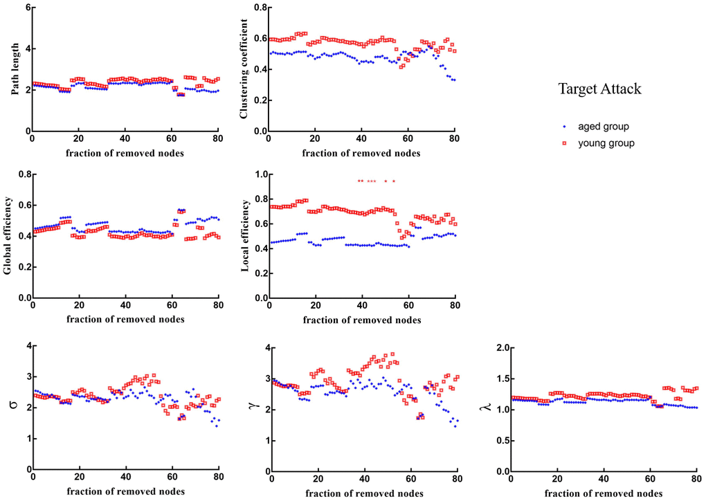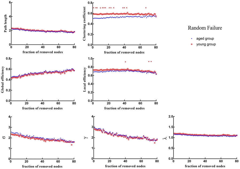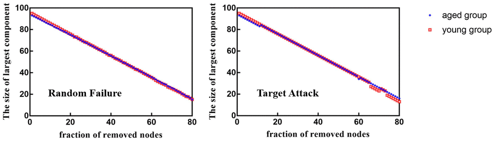 Compared with aged rats, the networks of young rats were generally more robust to random failure and targeted attack in order of nodal BC.