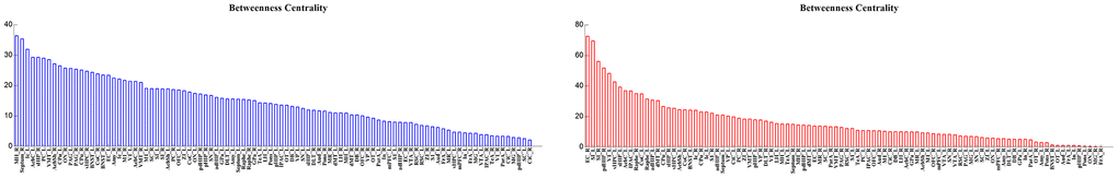 When 39%, 40%, 43%, 44%, 45%, 50% and 53% of nodes were removed in order of nodal BC, the Eloc of brain networks in aged rats was significantly lower than that in young rats (p < 0.05) (Figure 6). Figure 7 shows the brain regions in descending order of BC. We also calculated the size of the largest remaining component when nodes were continuously removed. When the nodes were removed, the size of the largest connecting component in both groups steadily and approximately decreased (p > 0.05) (Figure 8).
