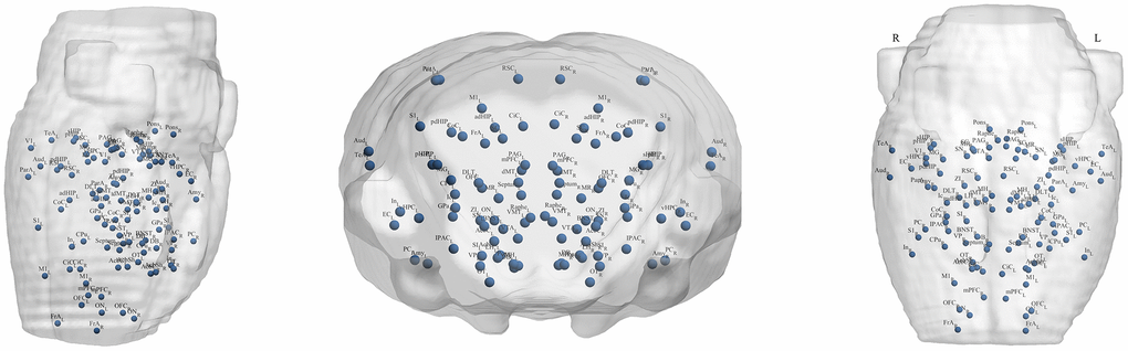 | V1, Cortex- Visual; AcbC, Nucleus Accumbens Core; CiC, Cortex- Cingulate; In, Cortex- Insular; mPFC, Cortex-Medial Prefrontal; IPAC, Posterior Limb of the Anterior Commissure; VP, Ventral Pallidum; ZI, Zona Incerta; FrA, Cortex- Frontal Association; S1, Cortex- Somatosensory; ParA, Cortex- Parietal Association; DB, Diagonal Band; TeA, Cortex- Temporal Association; VTA, Ventral Tegmental Area; AcbSh, Nucleus Accumbens Shell; SC, Superior Colliculus; OFC, Cortex- Orbitofrontal; ON, Olfactory Nuclei; MR, Mesencephalic Region; PAG, Periaqueductal Grey. | |||||||||||||||||||||||||||||||||||||||||||||||||||||||||||||||||||||||||||||||||||||||||||||||||||