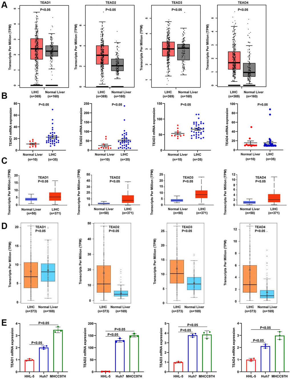 GEPIA is a database used to provide numerous GTEx and TCGA data [22]. We explored the level of TEAD family member in HCC tissues compared with normal tissues.