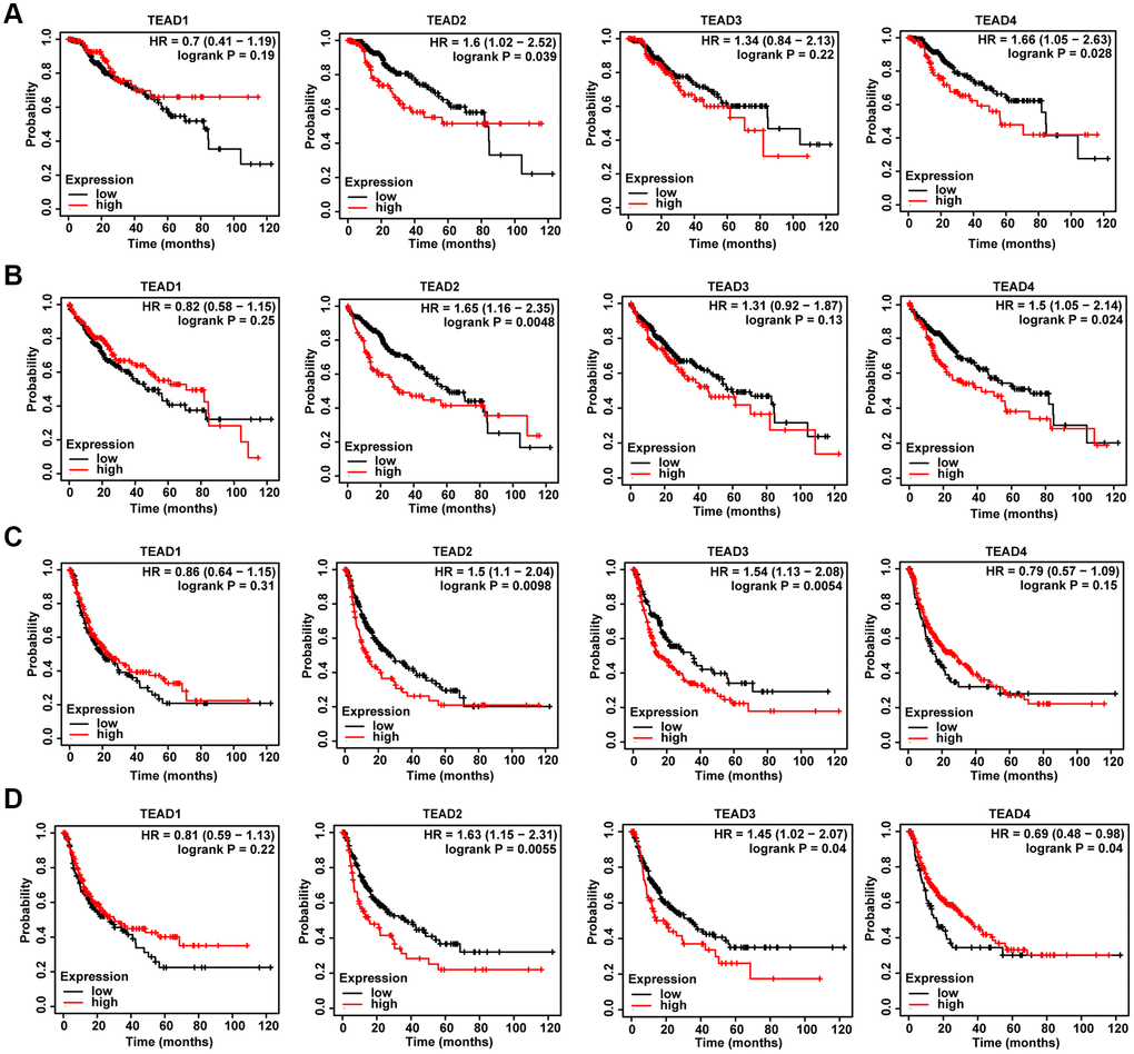 Kaplan-Meier plotter is conducted based on gene chip and RNA-seq data obtained from public databases [26]. We assessed the association between TEAD family members and the prognosis of HCC patients.