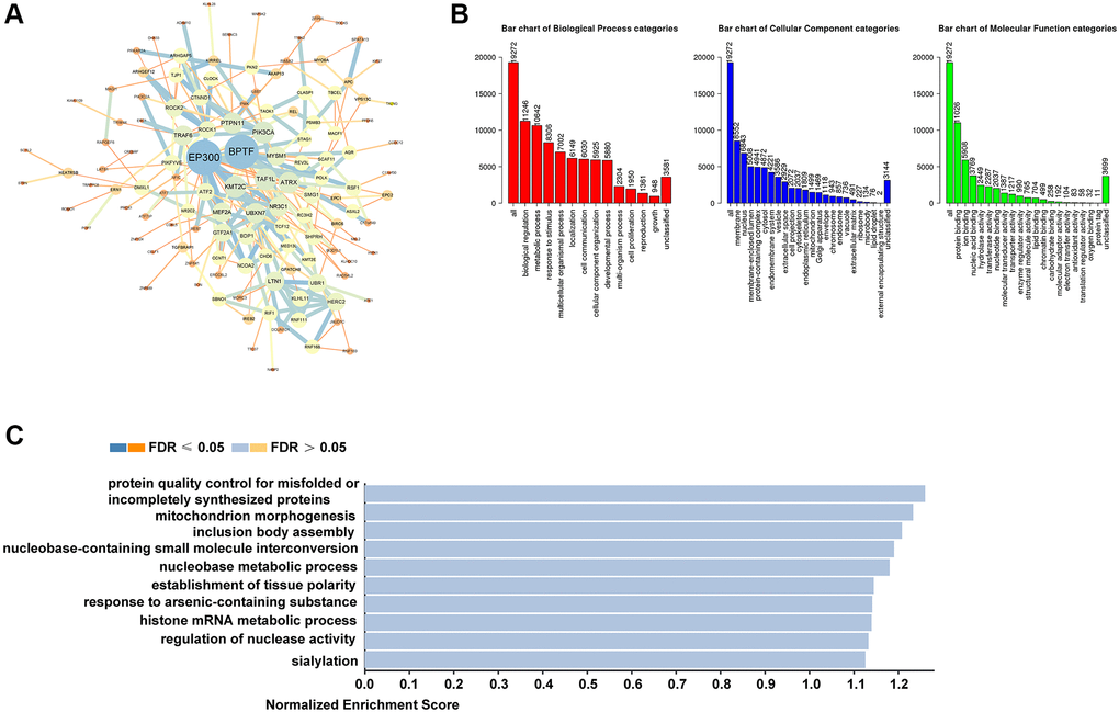 In order to survey the exact roles of TEAD family in HCC patients, we created a comprehensive biological function analysis. From the cBioPortal database, 19272 genes were downloaded. Then, we chose the top 200 coexpressed molecules most related to TEAD family to create a PPI network by using STRING and Cytoscape software (Supplementary Table 2). Results revealed that EP300 and BPTF were mainly correlated with the TEAD family regulation (Figure 3A). Next, we employed the WebGestalt web tool to completed the GO and KEGG analysis. In terms of biological processes, the metabolism was mainly for TEAD family participated (Figure 3B). In addition, TEAD family was primarily enriched in membrane (Figure 3B). Finally, TEAD family was obviously related to nucleobase-containing small molecule interconversion and nucleobase metabolic process (Figure 3C).