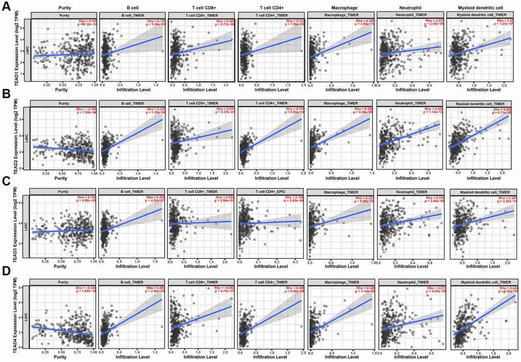 To explore the connection between the two aspects, we acquired the information from TIMER database. Results showed that TEAD1 was positively associated with B cells, CD8+ T cells, CD4+ T cells, macrophages, neutrophils and dendritic cells (Figure 4A). Moreover, the expression of TEAD2/3/4 was positively related to the immune cells (Figure 4B–4D). Meanwhile, we further found that there was an obviously association between the clinical outcome and immune cells in HCC patients. (Table 2).