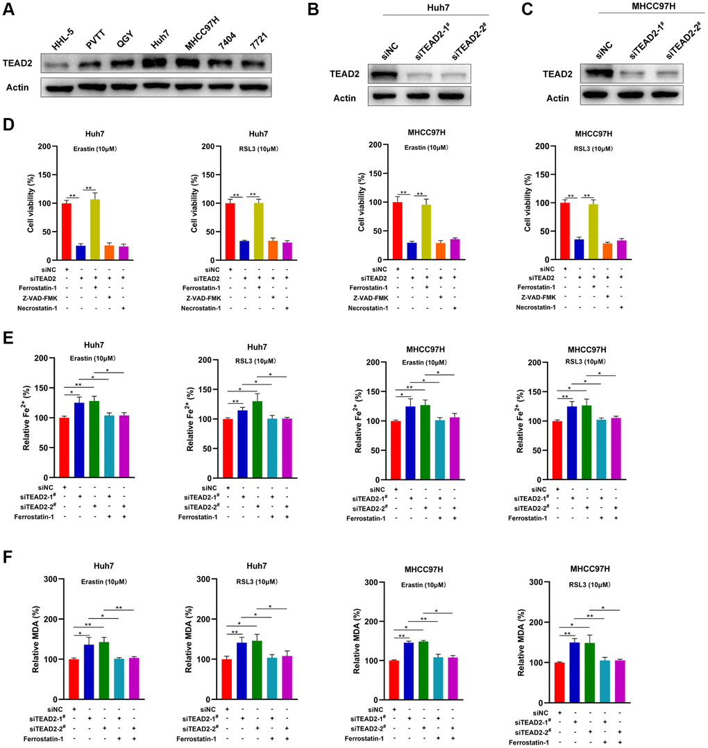 Antibodies and chemicals were employed in the study: TEAD2 (21159-1-AP, Proteintech), Actin (66009-1-Ig, Proteintech), erastin (B1524, APExBIO), RSL3 (B6095, APExBIO), Ferrostatin-1 (A4371, APExBIO), Z-VAD-FMK (A1902, APExBIO), Necrostatin-1 (A4213, APExBIO).
