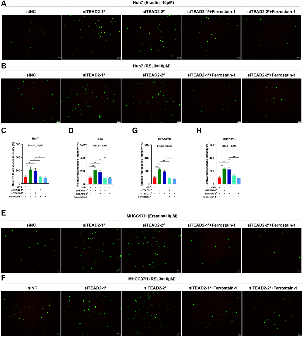As we all know, Fe2+ and lipid peroxidation were participated in ferroptosis [34]. In Figure 5E, inhibited the expression of TEAD2 increased the intracellular Fe2+ accumulation in both Huh7 and MHCC97H cells after erastin and RSL3 treatment, this phenomenon could be reversed by ferrostatin-1. As MDA and ROS were the crucial products of lipid peroxidation, we explored whether the indicator could be impacted by TEAD2. Results displayed TEAD2-deficient elevated the MDA levels in Huh7 and MHCC97H cells and the process could be reversed by ferrostatin-1 (Figure 5F, Figure 6A–6H). These results showed that TEAD2 overexpression could regulate Fe2+ accumulation and lipid peroxidation in HCC cells.