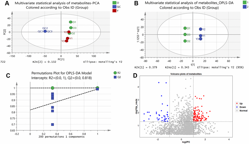 Based on the data of non-targeted metabolomics, we established a multivariate statistical analysis model to reveal the changes of metabolites in old BMSCs and young BMSCs. Intensities were corrected for signal drift and batch effect by fitting a locally quadratic (loess) regression model to the median intensity of pooled QC samples. After correction, the median area of all pooled QC samples was now the same. Metabolites with a coefficient of variation (CV) in QC samples >25% were then filtered out, due to their unstable quantifiability. In the end, a total of 1886 annotated metabolites were obtained, including positive ion modes and negative ion modes, as well as some details information such as m/z, retention time and peak intensity.