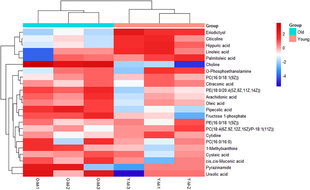 On the basis of the accuracy of MS data, the exact mass of each feature was submitted to ChemSpider with 4 databases selected (BioCyc; Human Metabolome Database; KEGG; LipidMAPS). According to the predicted value of VIP in the OPLS-DA model and the return p-value of the t-test, 23 metabolites with significant changes were screened as candidate biomarkers (VIP > 1 and p-value <0.05), which were displayed using a heatmap (Figure 2). Details of 23 differential metabolites are shown in Table 1. As shown in the heatmap, the differential biomarkers can distinguish the old BMSCs group from the young group, indicating that the biomarkers we have obtained were reliable.