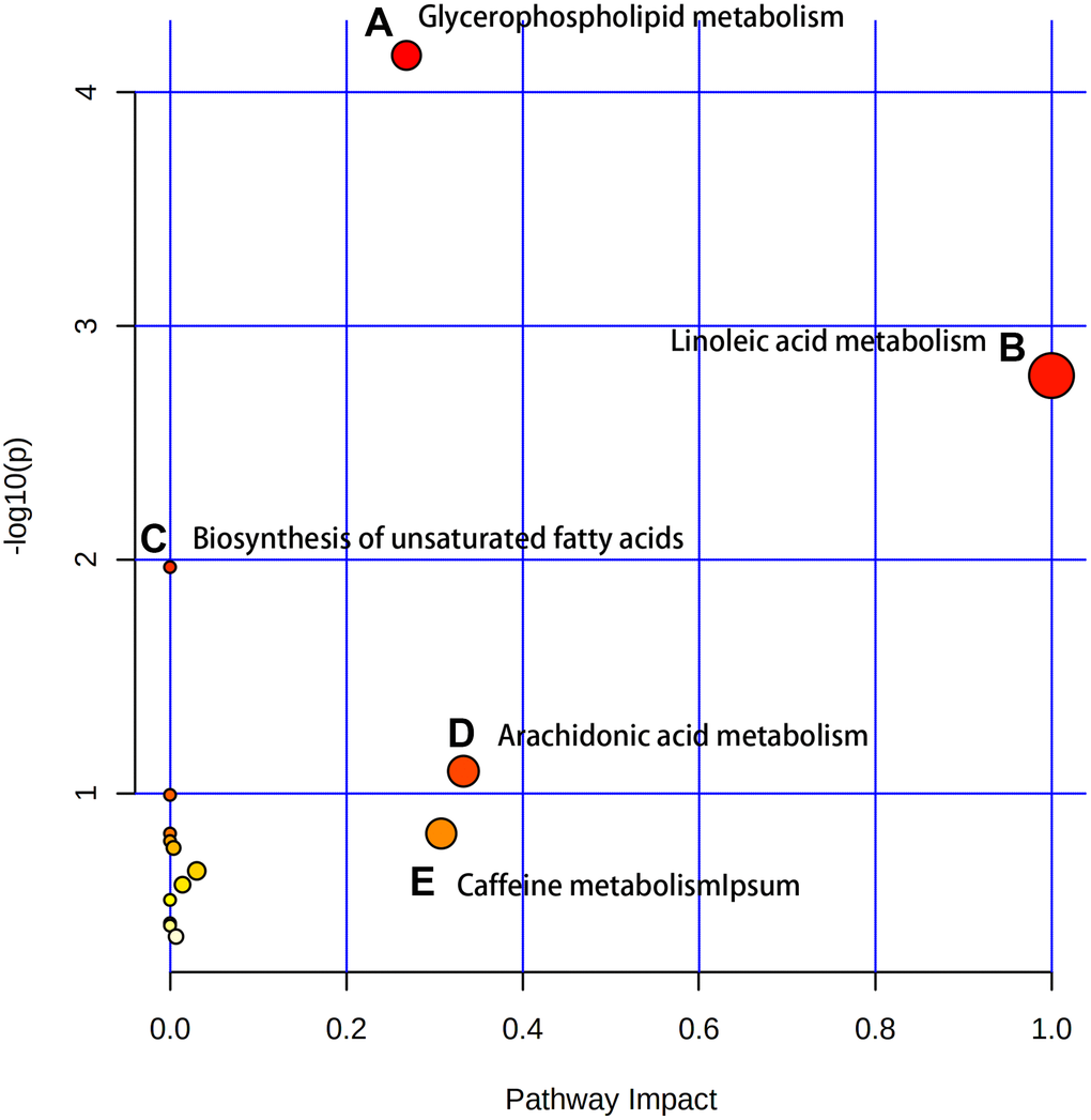 After identifying the candidate biomarkers, we enriched 15 disordered metabolic pathways by using MetaboAnalyst 4.0: glycerophospholipid metabolism, linoleic acid metabolism, biosynthesis of unsaturated fatty acids, arachidonic acid metabolism, caffeine metabolism, taurine and hypotaurine metabolism, phenylalanine metabolism, alpha-linolenic acid metabolism, glycosylphosphatidylinositol (GPI)-anchor biosynthesis, fructose and mannose metabolism, sphingolipid metabolism, lysine degradation, cysteine and methionine metabolism, glycine, serine and threonine metabolism and pyrimidine metabolism (Figure 3). Details of these disordered metabolic pathways are shown in Table 2.
