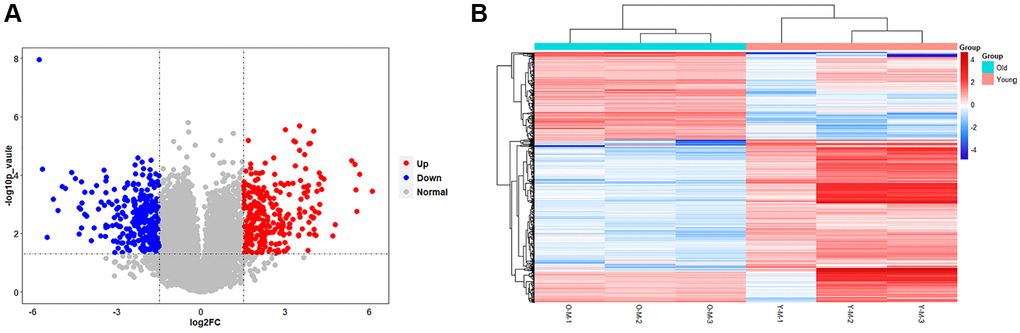 The results of the transcriptional group showed that there was a remarkable difference in gene transcription levels between the old BMSC group and the young BMSC group. A total of 16205 RNAs were detected, and 14574 meaningful RNAs (FPKM > 0.5) were screened. We further confirmed the screening conditions of |log2(foldchange)|> 1.5 and p-value < 0.05. Based on this condition, 590 RNAs with significant differences were considered to be DEGs. Compared with the young group, the expression of 311 RNAs were down-regulated and 279 RNAs were up-regulated in the old BMSCs group. The volcanic plots visually showed the variation trend of these RNAs (Figure 4A). We proved further that the 590 DEGs identified in the form of a heatmap (Figure 4B), and we found that DEGs could separate the old BMSC group from the young group, indicating that the DEGs we obtained were reliable.