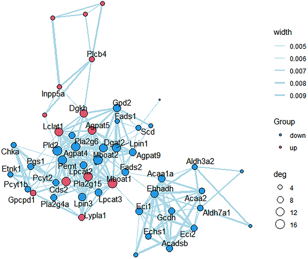 KEGG pathways related to lipid metabolism were selected, and protein-protein interaction (PPI) network was further constructed between the des enriched in these pathways (Figure 6). Scd, Mboat2, Agpat5, Dgat2, Fads2, Lpin1, Acaa2, Lpcat3, Pcyt2 and Pla2g4a were strongly correlated with other proteins (connected with >3 proteins).