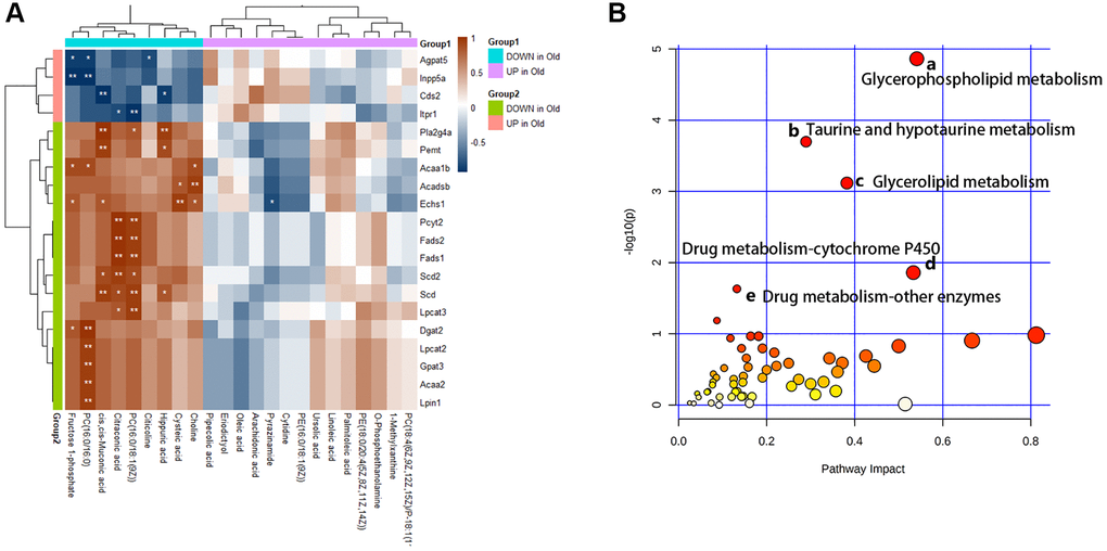 Furthermore, we analyze the changes of metabolic pathways in the process of cellular senescence by integrating metabolomic and transcriptome data, so as to better understand the mechanisms of BMSCs senescence from a metabolic point of view. 52 KEGG metabolic pathways (Figure 7A) were enriched by integrating data, of which 5 metabolic pathways (p-value < 0.05 and Impact > 0.1) had visible changes in the process of cellular senescence, and 29 metabolic pathways (p-value > 0.05 but Impact > 0.1) were potentially associated with cellular senescence. In order to understand the metabolic response of senescent BMSCs at the transcriptome level, correlation analysis heat map of the connection between differential metabolites and DEG was established (Figure 7B). The DEGs involved in lipid metabolism exhibited the most dramatic changes in BMSC senescence. The differential metabolites in lipid metabolism were extremely correlated and statistically significant with DEGS.