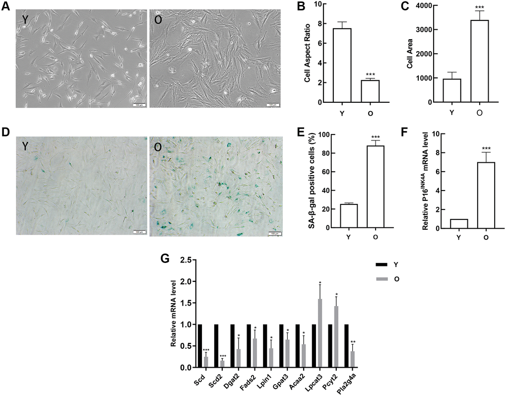 In order to verify the results of data analysis, we first obtained young and old BMSCs. With the aging of BMSCs, the cells gradually changed from long spindle to flat, lost vitality, and there were clear particles in the cytoplasm (Figure 8A). The analysis results indicated that compared with young BMSCs, the cell aspect ratios in old BMSCs decreased (Figure 8B) and the cell areas increased (Figure 8C). And the number and ratio of SA-β-gal positive cells in old BMSCs were obviously elevated by SA-β-gal staining (Figure 8D, 8E). Then the classical aging evaluation marker pl6INK4A mRNA was up-regulated in old BMSCs (Figure 8F). These data above displayed that old BMSCs presented senescent alterations. Further, RT-qPCR results demonstrated that consistent with the trend of high-throughput sequencing analysis, the expressions of Scd, Scd2, Dgat2, Fads2, Lpin1, Gpat3, Acaa2 and Pla2g4a in old BMSCs were down-regulated compared with the young group, and Scd2 decreased most significantly, while the expressions of Lpcat3 and Pcyt2 were up-regulated, which was opposite to the results of high-throughput sequencing (Figure 8G).