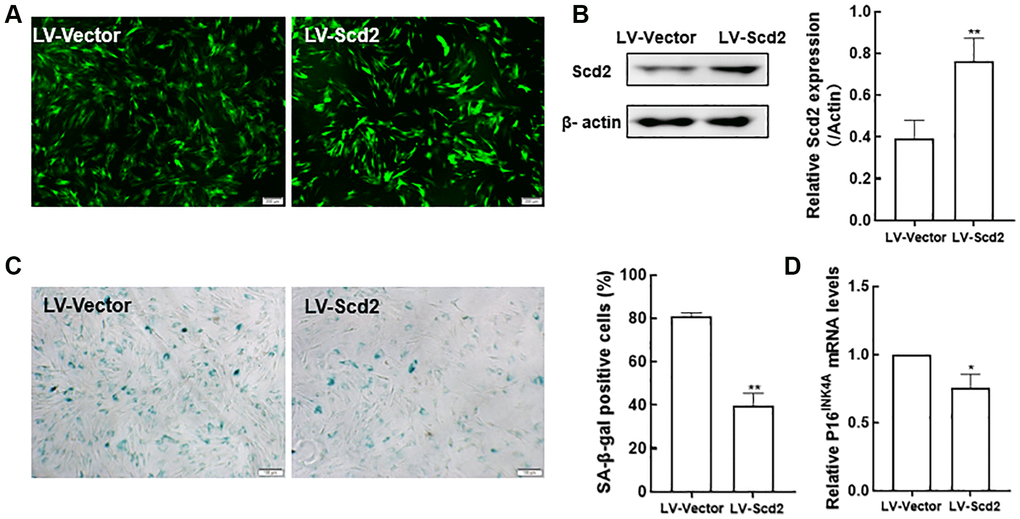 Since Scd2 gene was identified to be most significantly reduced in old BMSCs, further study was investigated whether BMSC senescence could be influenced by enforcing Scd2 expression. For this purpose, senescent BMSCs were transduced with lentivirus expressing Scd2 (LV-Scd2) and the lentiviral vector (LV-Vector). Fluorescence microscopy showed that Scd2 was successfully over-expressed in old BMSCs (Figure 9A). Scd2 expression at protein level was obviously up-regulated in the LV-Scd2 group compared with that in the LV-Vector group, which was confirmed by Western blot (Figure 9B). Furthermore, SA-β-gal staining and quantitative analysis demonstrated that SA-β-gal activity in Scd2-suffficient BMSCs was dramatically diminished in the LV-Scd2 group (Figure 9C). And P16INK4a mRNA expression was markedly down-regulated after Scd2 repletion (Figure 9D). Accordingly, the above data manifested that Scd2 replenishment can attenuate BMSC senescence.