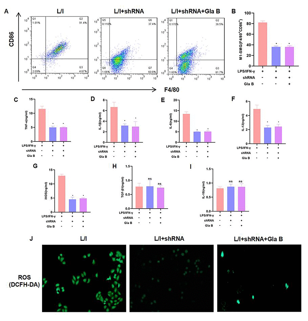 Figure 3. The role of NF-κB (p65) in Glaucocalyxin B-induced inhibition of SMG M1 polarization. (A–B) P65 silencing could inhibit SMG M1 polarization and Gla B cannot further inhibit M1 polarization. There was no difference between groups. Comparison with L/I, *P < 0.05. (C–I) Detection of M1/M2 cell marker proteins. Gla B cannot further down-regulate the levels of TNF-α, IL-1β, IL-6, iNOS and IL-12 in P65 silenced cells. Comparison with L/I, *P < 0.05. (J) Detection of ROS showed that Gla B could not further down-regulate the level of ROS in cells with P65 silencing.