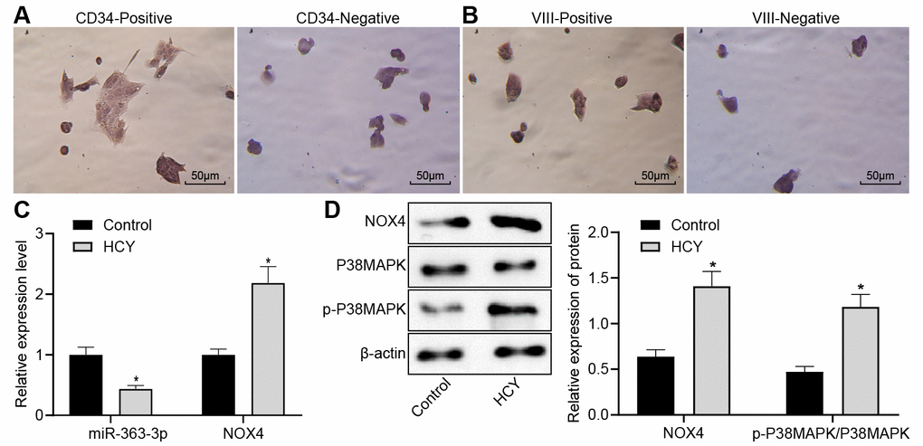 Reduced miR-363-3p expression and abundant NOX4 and p38 MAPK expressions in HCY-induced CAECs. (A) positive and negative staining for goat antibody to CD34 (scale bar = 25 μm); (B) positive and negative staining for rabbit antibody to Factor VIII (scale bar = 25 μm); (C) miR-363-3p expression and NOX4 mRNA expression were determined by RT-qPCR in HCY-induced CAECs; (D) Representative Western blots of NOX4, p38 MAPK and p-p38 MAPK proteins and their quantitation in HCY-induced CAECs, normalized by β-actin. The data were analyzed by paired t-test. n = 3. * p < 0.05 vs. the control group; CAECs, coronary arterial endothelial cells; SP, streptavidin-peroxidase.