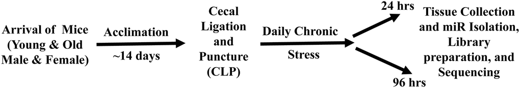 Figure 1. Schematic diagram of the experimental paradigm for sepsis induction, daily chronic stress (DCS), and tissue collection. Young adult (~4 months) and old (~20 months) male and female mice were purchase from Jackson Laboratory (JAX Bar Harbor, ME). Prior to initiation of the experiment, mice were acclimated to a 12-hour light-dark cycle for a minimum of 14 days. Sepsis was induced by employing cecal ligation and puncture (CLP) under isoflurane anesthesia. DCS was conducted by placing mice in weighted plexiglass animal restraint holders (Kent Scientific; Torrington, CT) for 2 hours daily commencing the day after CLP. Mice were euthanized for tissue collection either 24 or 96 hours post CLP+DCS. The hippocampus was dissected, flash frozen, and stored at −80, for miR isolation and sequencing.