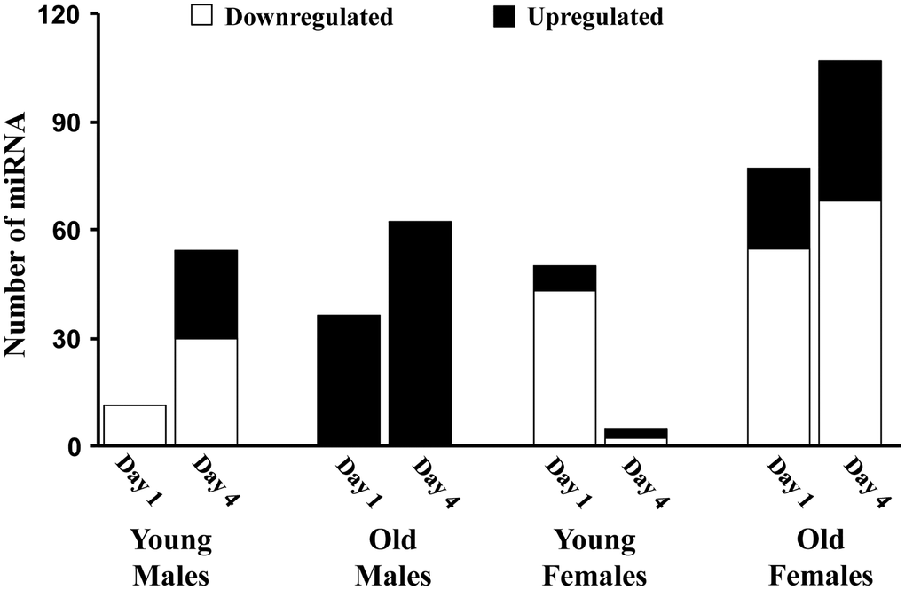 Figure 2 illustrates the global pattern of differentially expressed miRs (DEmiRs) in young and old adult male and female mice, specifically 1 or 4 days following sepsis compared to sex and age-matched controls. In general, females and older animals exhibited a more robust response on day 1, with an increased number of DEmiR. Interestingly, the largest changes were for downregulated miR with the exception on older males, which exhibited only up regulated miR. Young females exhibited considerable recovery on day 4, observed as a marked decrease in the number of DEmiR. For the other groups, there was an increase in DEmiR on day 4, mainly for upregulated miR, except for older females, which exhibited increased expression of up and downregulated miR. The increase in upregulated miR was particularly robust for older males, which exhibited the greatest number of upregulated miR on day 1 and day 4.