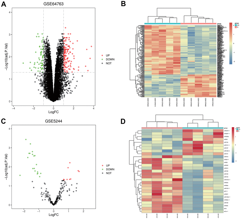 GSE64763 dataset, related to uterine leiomyoma, and GSE5244, one miRNA dataset, were downloaded from the GEO database. According to criteria of p-value<0.05 and |logFC|<1, DEGs were screened in GSE64763. A total of 204 DEGs were found in uterine leiomyoma, among which 139 were up-regulated, and 65 were down-regulated. The ggplot2 package was used to construct the visual volcano map of GSE64763 in R software (Figure 1A). The cluster analysis heatmap of DEGs was drawn via the pheatmap package (Figure 1B). The same method was used to construct a visual volcano map (Figure 1C) and cluster heatmap (Figure 1D) for the GSE5244.