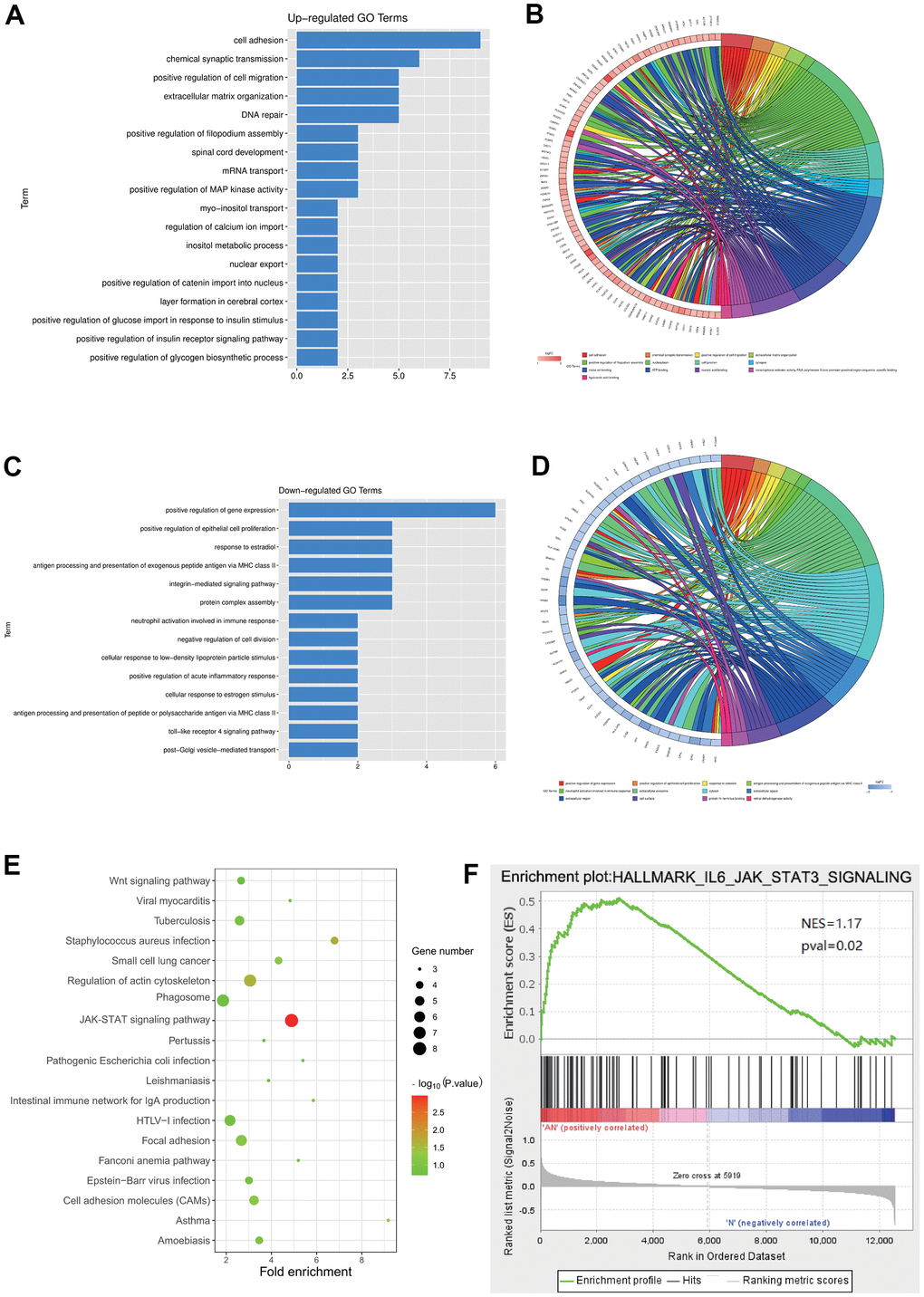 Go and KEGG enrichment analyses of the DEGs in the GSE64763 dataset were performed. R language was used to draw enrichment maps of the up-regulated DEGs, which were mainly enriched in the cell adhesion, chemical synaptic transmission, positive regulation of cell migration, positive regulation of filopodium assembly, spinal core development, mRNA transport, positive regulation of MAP kinase activity, and inositol metabolic process (Figure 2A, 2B). GO enrichment of the down-regulated genes were enriched in positive regulation of epithelial cell proliferation, response to estradiol, antigen processing and presentation of exogenous peptide antigen via major histocompatibility complex (MHC) class II, integrin-mediated signaling pathway, negative regulation of cell division, and positive regulation of acute inflammatory response (Figure 2C, 2D). KEGG showed that the main enriched pathways included Wnt signaling pathway, JAK-STAT signaling pathway, and focal adhesion (Figure 2E). In addition, through GSEA analysis, it was concluded that the JAK-STAT3 signaling pathway was a significantly enriched pathway for uterine leiomyoma (Figure 2F).