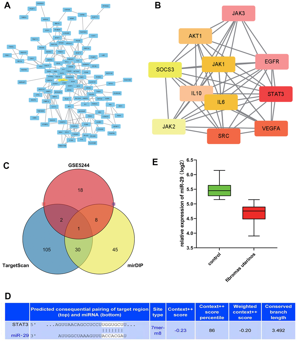Therefore, this study intends to use bioinformatics technology to excavate the core genes between uterine leiomyoma and normal uterine tissues and conduct enrichment analysis and pathway analysis. The significant role of miR-29 and STAT3 in uterine leiomyoma was verified using public data sets. Basic cell experiments were used to explore the potential regulatory mechanism of miR-29b on STAT3 in uterine leiomyoma to provide basic research for clinical treatment.