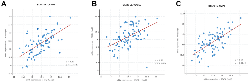 The expression level of miR-29c in different groups was analyzed. It could be seen that the expression of miR-29c was lower in the uterine leiomyoma group than in the control group (Figure 3E). Correlation analysis showed that STAT3 was positively correlated with CCND1, VEGFA, and MMP2/9, respectively (Figure 4).